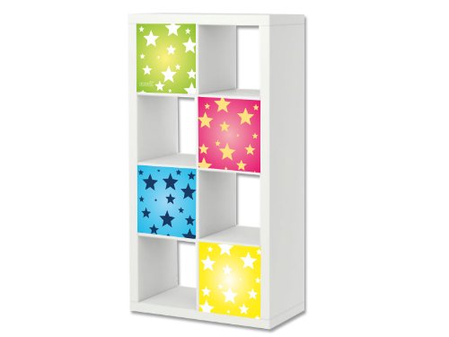 "Sterne" (bestehend aus 4 Aufklebern) passend für das Regal EXPEDIT / KALLAX von IKEA. Die Aufkleber lassen sich für den Einsatz mit Tür sowie für den Einsatz mit zwei Schubladen optimal verwenden. Die Anordnung der Möbelsticker kann nach eigenen Wünschen variiert werden. Das exklusive Aufkleber-Set